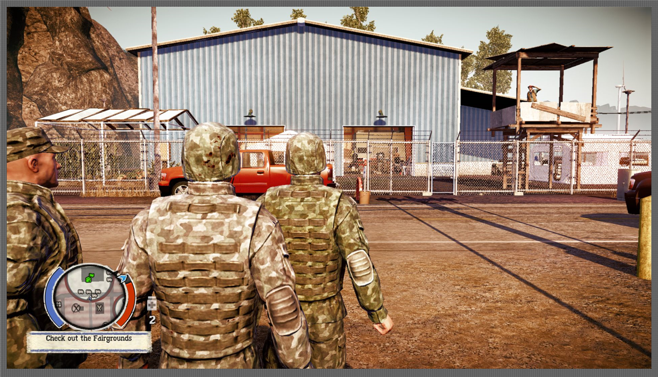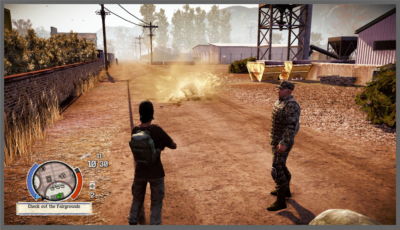 The game gives you command of a group of survivors and a base of operations that needs protection. You then get a few excuses to go around massacring scores of undead, but that is basically all that there is to it. There is hardly any story there and the many painful and revealing moments that one sees in movies or stories are only casually referred to. The whole plot is as thin as it can be and the thirty plot related missions are often something like: drive to a person and hear what he has to say. You then get delivered a few lines of voiced text in which you have no options but to listen and your chosen avatar of the moment will be scripted to agree to do what is being asked. Only once will two different plot lines interact and you faced with a moral decision. This is not a roleplay game with heartbreaking decisions to any degree.