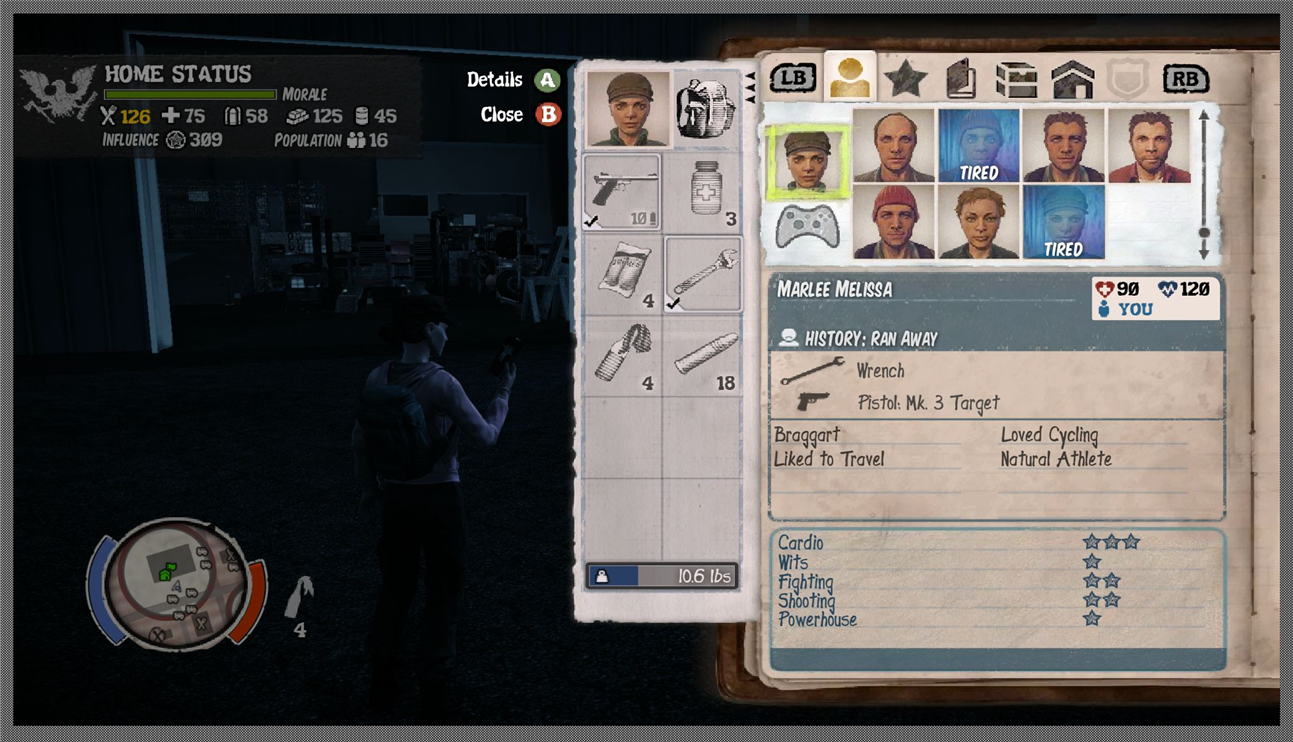 You are actually not one person, but a group of persons. At first that part of your group of survivors that have a friend status. Eventually that will be everyone in your community, but at first you can only play Marcus and Maya. Maya joins Marcus already in the introduction part of the game, so you basically start out with two characters. But you will find that your community will quickly grow in size for better or worse, for more people means more mouths to feed and more beds to fill. On the other hand, more people increases the chance of having one with that special skill that makes the garden grown more food or that can turn a workshop into a munitions shop.
