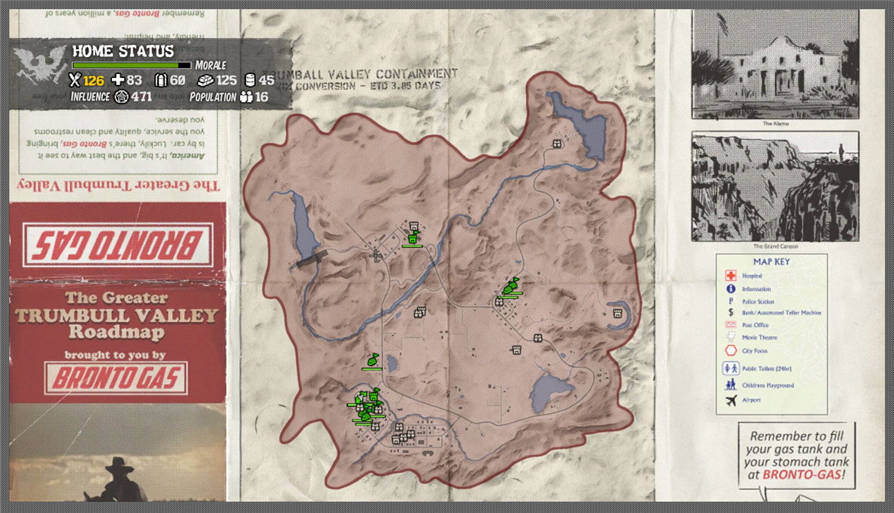 The homebase you get can be established and provided with facilities. A few can be upgraded once, some twice. There are like eight home bases available in the game. That sounds like much, but down to earth there are actually only two that make any sense: McReady Farmhouse and Snyders Trucking Warehouse. All the others are actually too small and the only other big one, the Trumbull County Fairgrounds becomes only available (too) late in the game and would require to hold back upgrading facilities until you can move into it. You will find however that you want to upgrade your home base as soon as possible and you will be done upgrading mid game. Hence moving to a new base to start again from scratch is hardly an option and would required a lot of extra materials.
