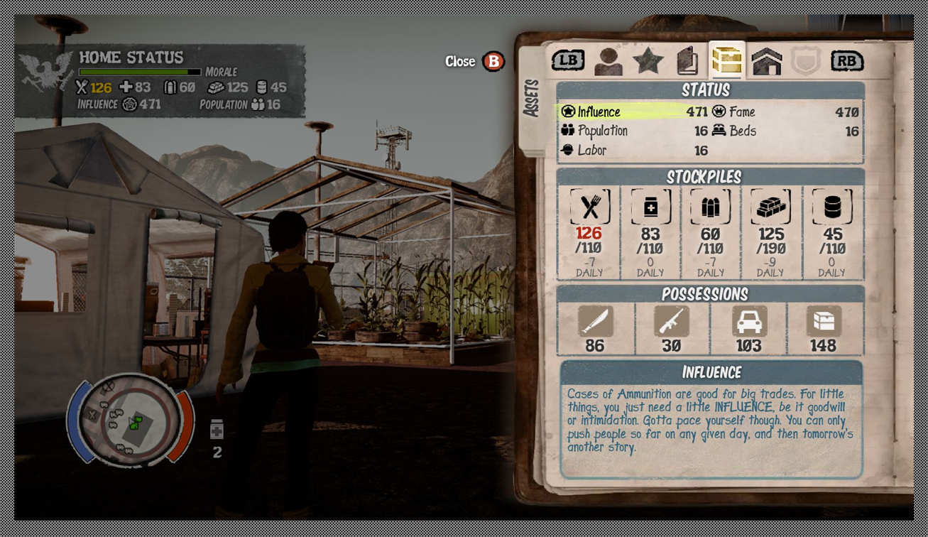 One seriously lack is being unable to influence other survivor colonies. They will show a trust bar, suggesting you can recruit them if they fully trust you, but except when they offer you a random mission(usually not more then twice) there is no way to increase their trust. In fact it looks like that was never meant to be and the trust bar is a relation towards how much you pay for buying items from them, strangely enough some do not even have items to sell. After a while most of these colonies disappear because they are overrun by hordes, except when they are required for the plot. I tried to save one of these location by surrounding it with outposts, which went well when I was playing, but when I logged in the next day it was gone anyway.