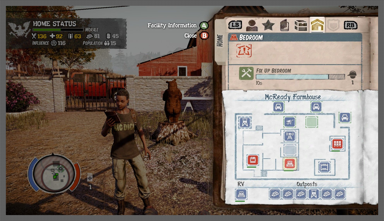 Homebases are the places where your group of survivors hide out, where you can stash supplies and equipment and repair weapons and cars. Most home bases have slots available to create a workshop, garden, watch tower and the like. Some of these can be upgraded. Some of these repair your cars, others you can use to make medicines and yet others allow you to make ammo.