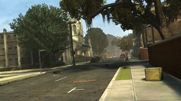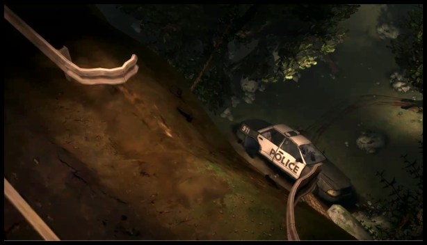 After the police car hits a roaming zombie, it slips, crashes through this rail and ends up at the bottom of this slope. While this is a very unlikely occurrence (those rails can stop trucks) this makes for a very engaging shot from above. Note the corpse of the cop in the right top corner and the trails of blood that runs from the car to him. The shades and dark lights create for an ominous scene. The sunny happy mood has been replaced by gloom and creepy shadows. It is a cool way to make a picture. The look from above to below zooms out give an overview and also makes everything remote. Note that the darkness is on the edges. It creeps in from all sides.