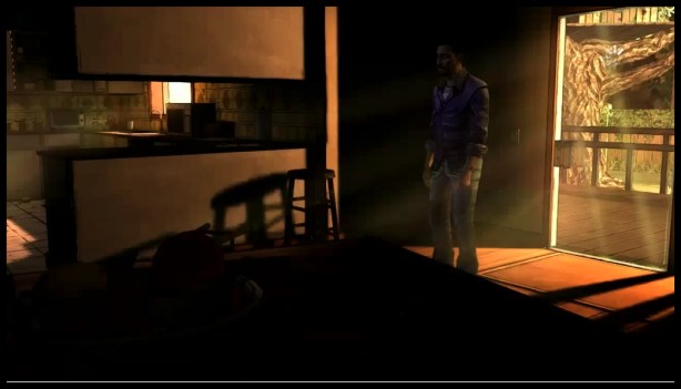 When Lee enters the nearby house he moves from out of the light into the darkness. Again creating an eerie atmosphere. This is the home where he meets Clementine. As you can see this whole setup is deliberately. In the previous pictures it is dark as if the evening has fallen. Then the scene is changed to an eerie sick yellow color. Here the color outside is almost golden, while inside darkness is hiding unknown dangers.