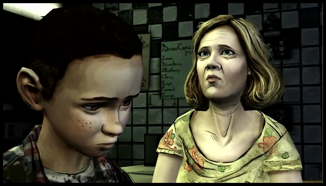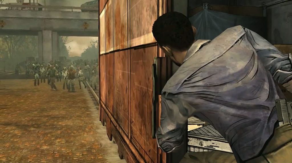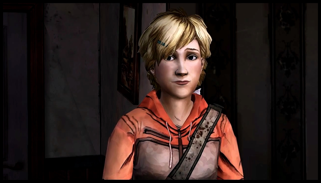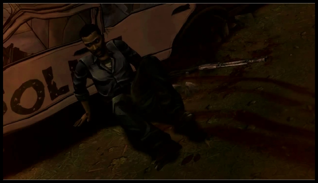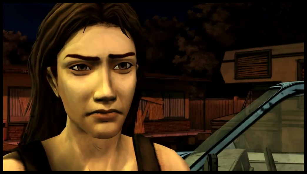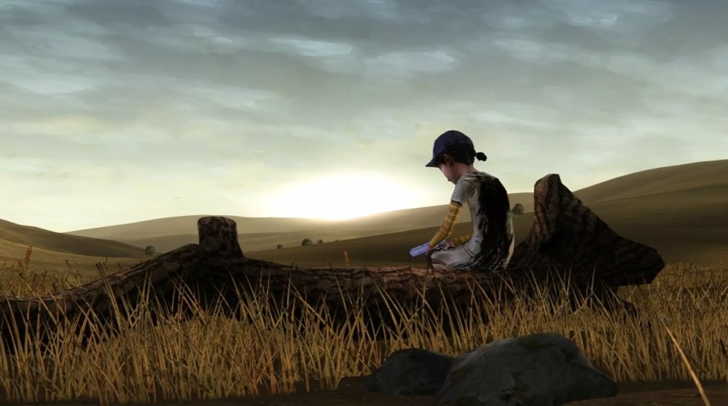 The above scene with the dark clouds that seem threatening is the stage for this little drama.. you have to either see her killed by the zombies or you have kill her yourself. Watching this scene gives me a sad shocked feeling. I know what is going to happen.. You can see she must have been through a rough time with her being dirty… she almost looks like a zombie at this point, and you can see the desperation on her face. He looking as a zombie creates this feel that she has been in the pit.. tries to escape.. Lee and Kenny are near.. yet within sight of salvation they can not help her..and only kill her quickly to spare her an agonizing death…
