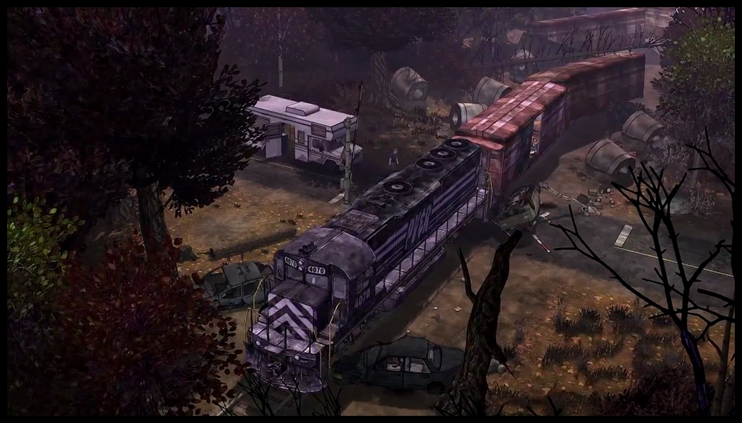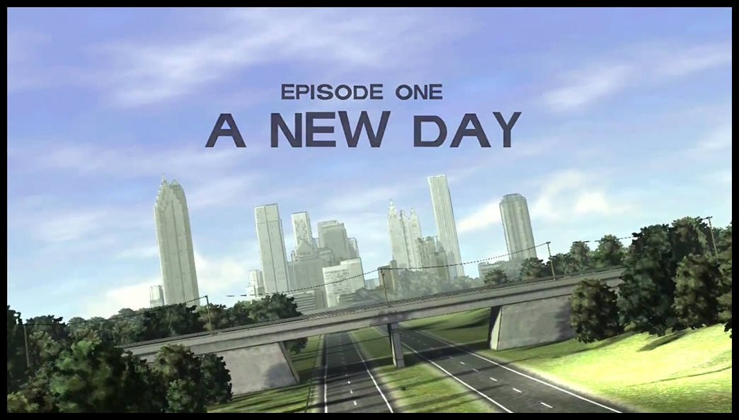 The walking dead opens with the skyline of Atlanta and it is a link between the television series, comic and the game. That way people will know the setting. In a later post I will comment further on the interaction of thoughts, feels and the use of language and imagery to invoke stories. Above the picture somehow I thought it read “A brand new day.” Note the beautiful blue sky and the sunny setting. Interestingly.. while this is the skyline of Atlanta we do no go to it.. the story takes us away from it. In this manner a possible conflict can be avoided. Bye bye Atlanta.