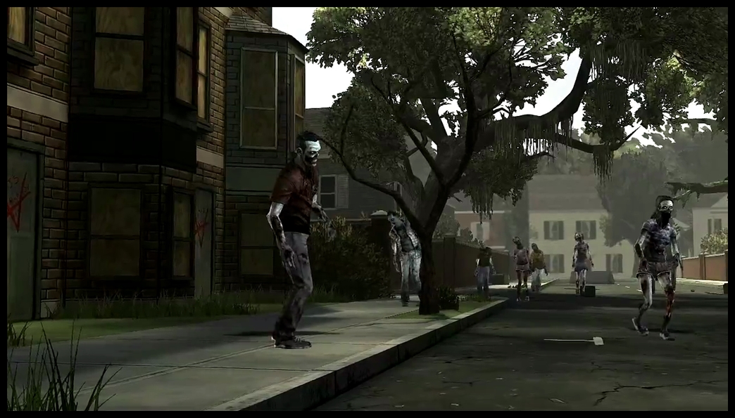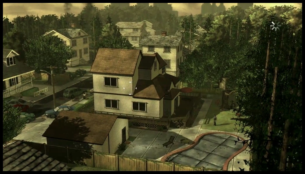 After escaping from the zombies Lee finds himseft on the grounds of this suburban home. The shot is zoomed out which show us he is completely alone.. his shouting made me cringe. This will be used several times during the game. Someone shouting in an otherwise silent place. Did you notice the eerie yellow sky and gloom? In the distance it almost looks like there are yellow vapors rising from the ground.