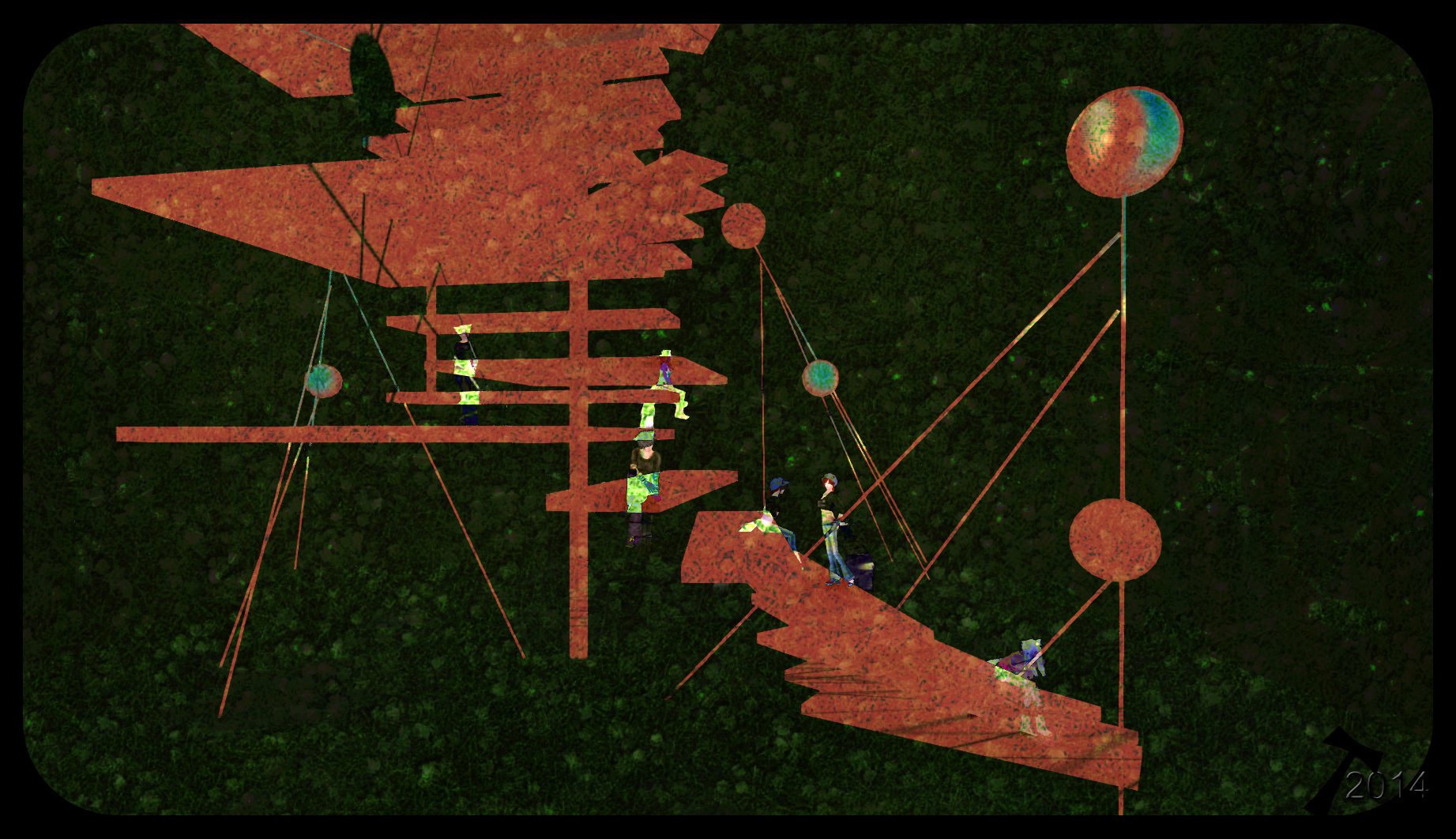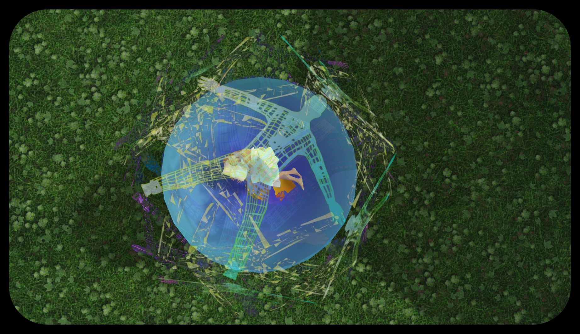 Description of exhibit: A sphere made of graphic figures, representing the global network, rotates around a sleeping figure. A lullaby starts playing when someone steps on the exhibition parcel via collision script.