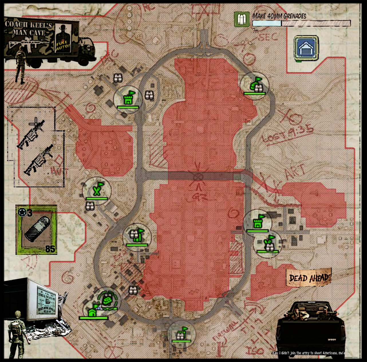 First, most obvious, the map has changed. The map is that of the city of Danforth. But the map is for a large part inaccessible. In fact the map consists basically of the road around the city and a about seven areas branching of the central road. There are therefore far less buildings to explore unlike the basic game, that had a lot of places to explore and to scavenge.