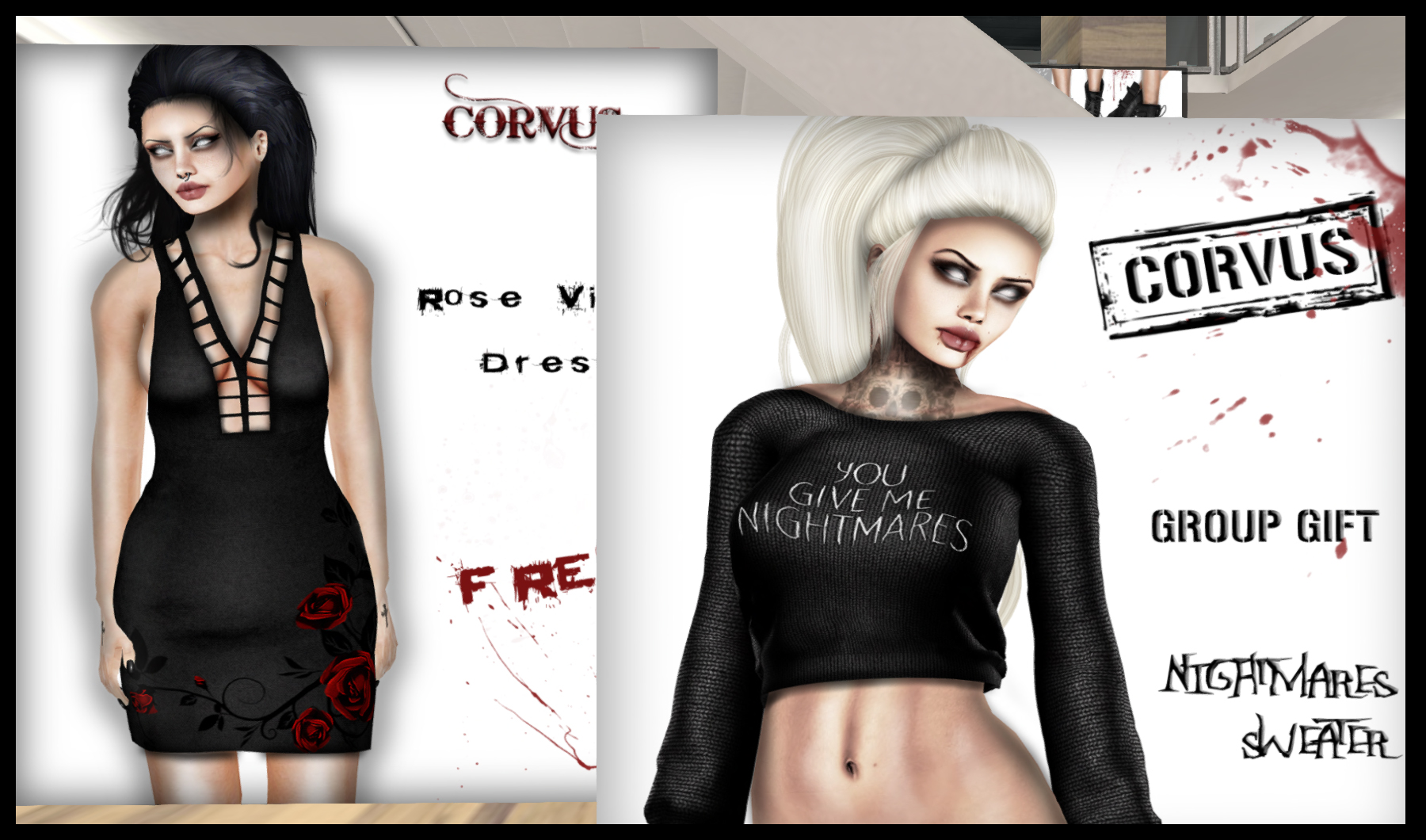 Well.. Dreary send me off to a place called Corvus to get her some tats and see if there was anything I liked. Corvus is a funny place as it has these clothes that you either love or hate. The style is a deranged mix of goth and punk, but not so weird that is isn’t main stream. The clothes might be revealing, but I don’t find them explicit sexy. It is more like pepper and salt, or vinegar and sugar. Black and white. But weird.