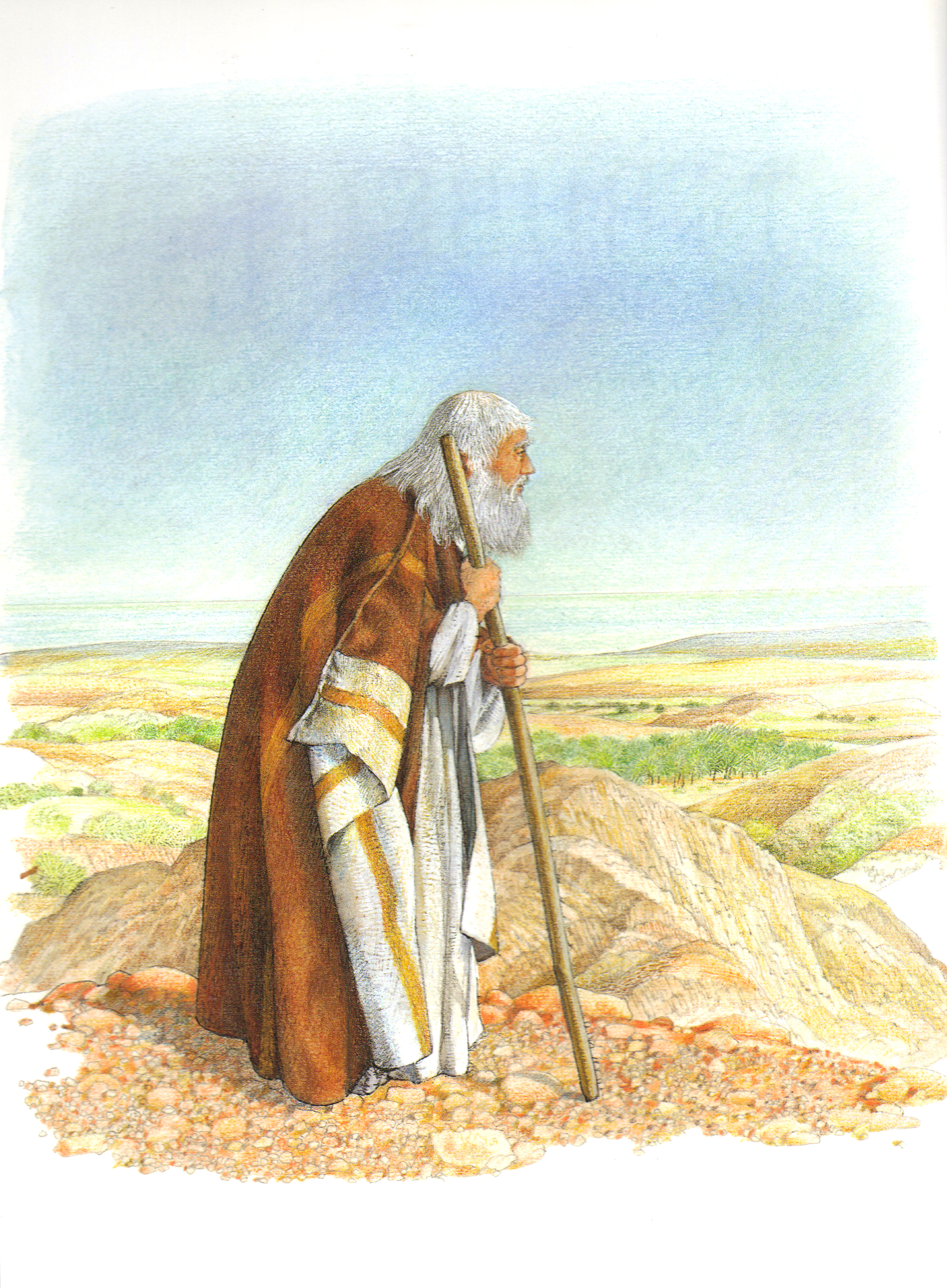 Above is the first large picture you see in the book and it shows Abraham looking at the promised land before dying. He was called Abram first, but his name was changed to Abraham when Yahweh* decided to make him the founding father of Israel. The story itself, to which this picture belongs, is further into the book after the creation stories. I wanted to show this picture because it is the first big picture in the book. The book is A4 in size and the style of drawing is the one you see above.