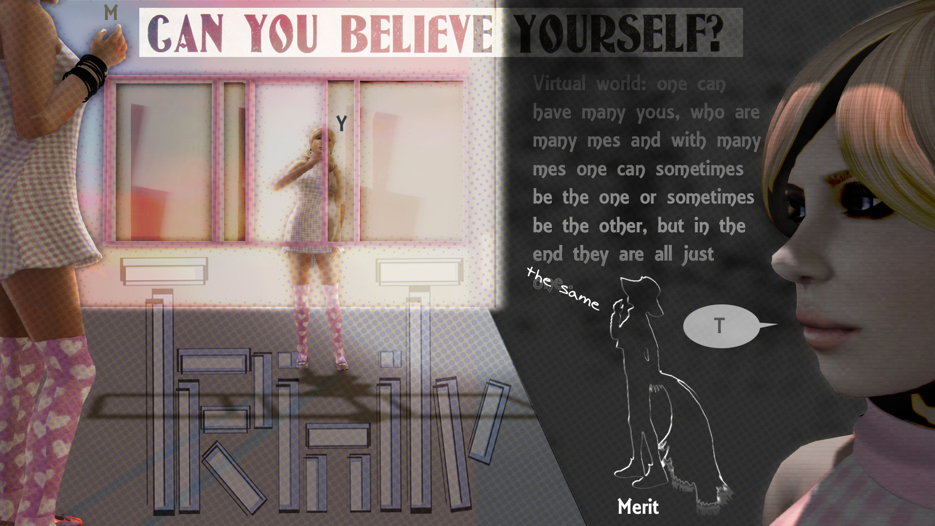 This picture was inspired by the fact that in Second Life you can make a copy of yourself that looks exactly the same as another avatar, however through behavior and other ways of being they can be different and perceived and treated differently by others.