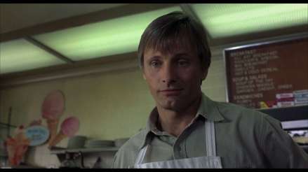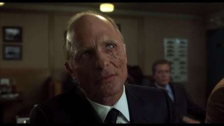 Tom is Joey and he meets his brother Richie Cusack, who is the head of a crime mob . We play the facial expressions in the scene next. We have William Hurt as Richie and of course Viggo Mortensen. Hurt possesses a wide range of facial expressions. Look while he chats with Tom/Joey and look what happens in the background. Richie knows what is going to happen, he orders it.