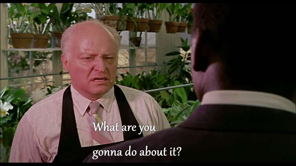 Another scene I find intriguing happens about halfway into the movie. Virgil Tibbs and Police Chief Bille Gillespie visit the local big wig plantation owner Endicott played by Larry Gates. The scene is set in a greenhouse where Endicott is tending to Orchids. After an intro, which is in itself epic, talking about orchids and comparing the meticulous tending of orchids to the tending of blacks the two policemen seem about to leave.